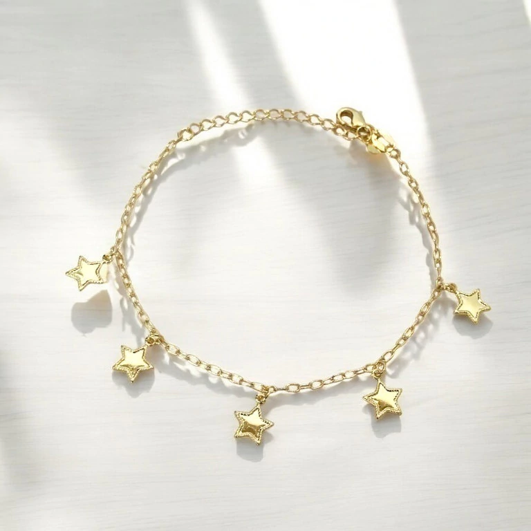 Esta pulseira com cinco estrelas é um símbolo de inspiração e elegância. Cada estrela lisa, banhada a ouro 18k, destaca-se ao longo da pulseira, criando um visual harmonioso e encantador. Com seu brilho suave e design delicado, essa peça é perfeita para adicionar um toque celestial ao seu estilo. Seja para o dia a dia ou para uma ocasião especial, ela combina leveza e sofisticação de forma única.